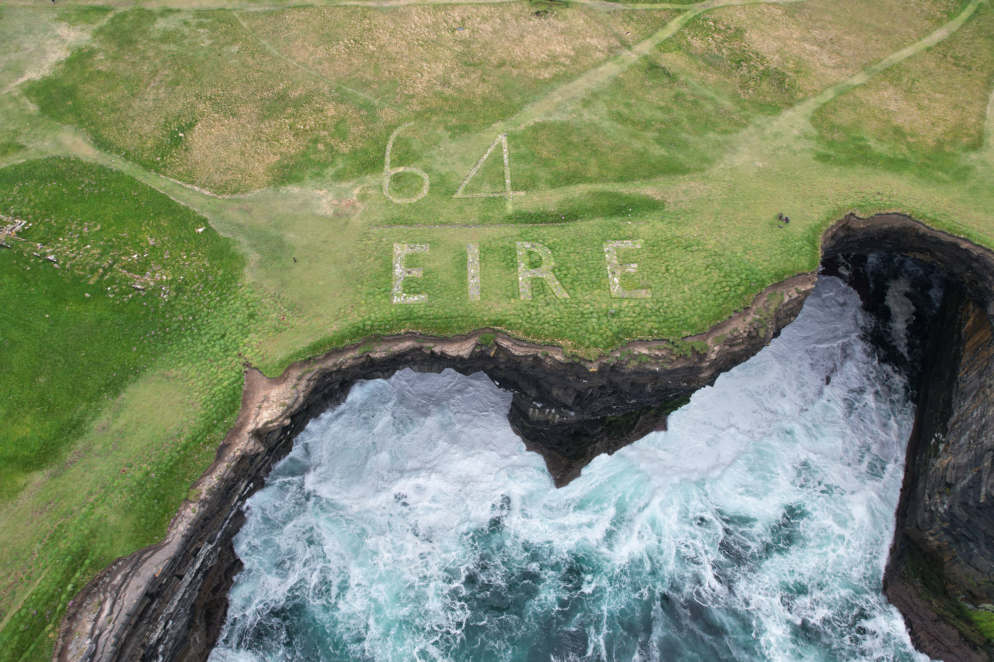 The well-preserved lookout post No. 64 is to be located at the tip of Downpatrick Head. It stands on the edge of the cliffs directly in front of Dún Briste Sea Stack, a well-known rock formation in the sea. The associated Eire sign is also located 50 metres away on the other side of the cliff.